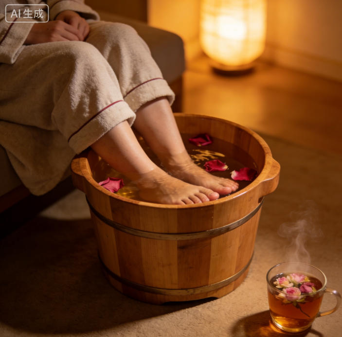 温水泡脚是睡前暖足的基础良方。水温控制在40-45℃为宜,水位没过脚踝,浸泡时间15-20分钟,待双脚微微发热、后背微微出汗即可。可在水中加入生姜片、艾叶或红花,生姜驱寒、艾叶温经,能增强暖足效果。注意避免水温过高,以免烫伤皮肤或导致神经兴奋影响睡眠。